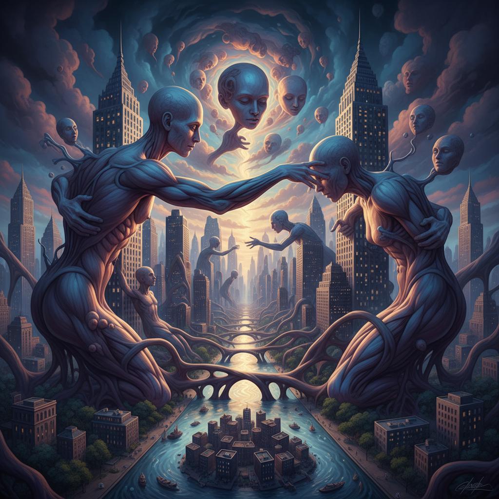 Image: A surreal cityscape with human figures subtly morphing. Alt text: "Surreal cityscape with morphing figures representing modern body horror."
