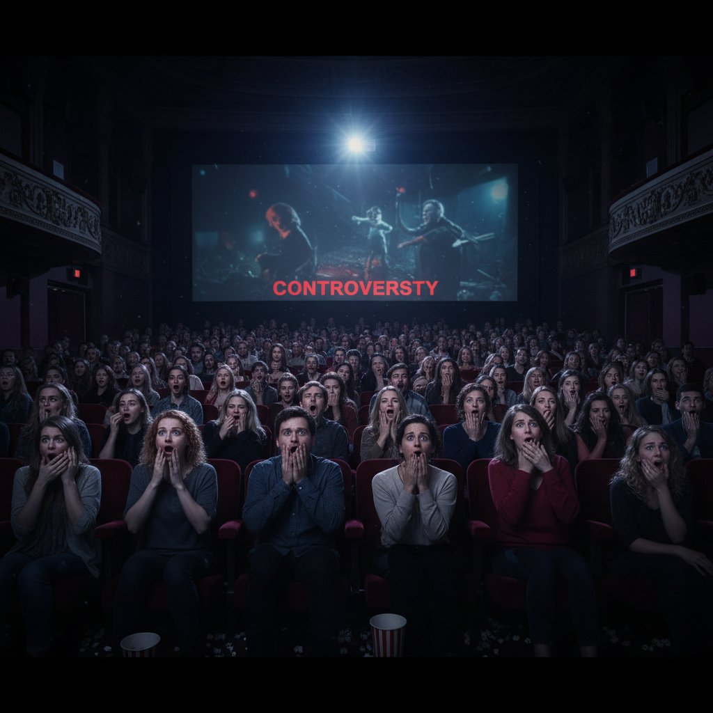 Alt text: Shocked moviegoers react to a controversial film, cinematic style, controversial movies.