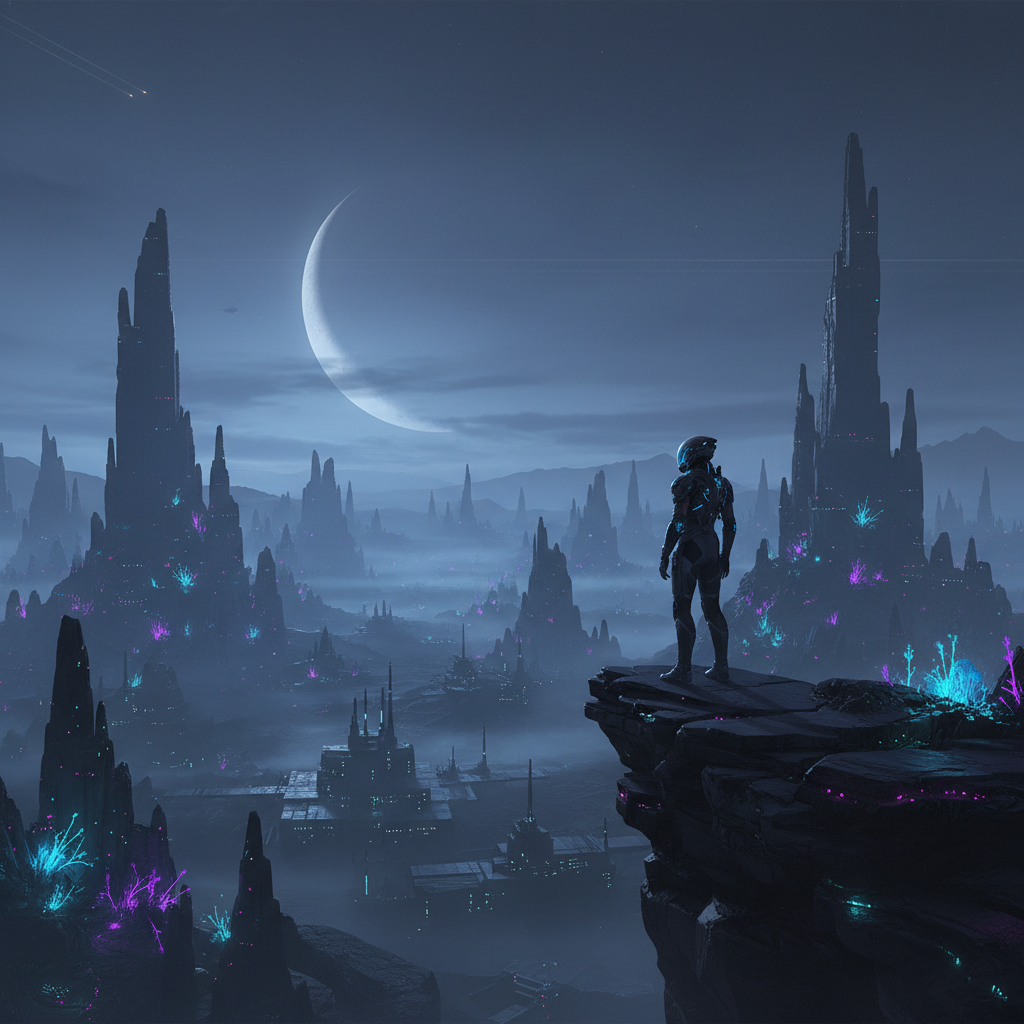 Expansive sci-fi landscape with minimal lighting and a lone figure, capturing Villeneuve’s visual genius.