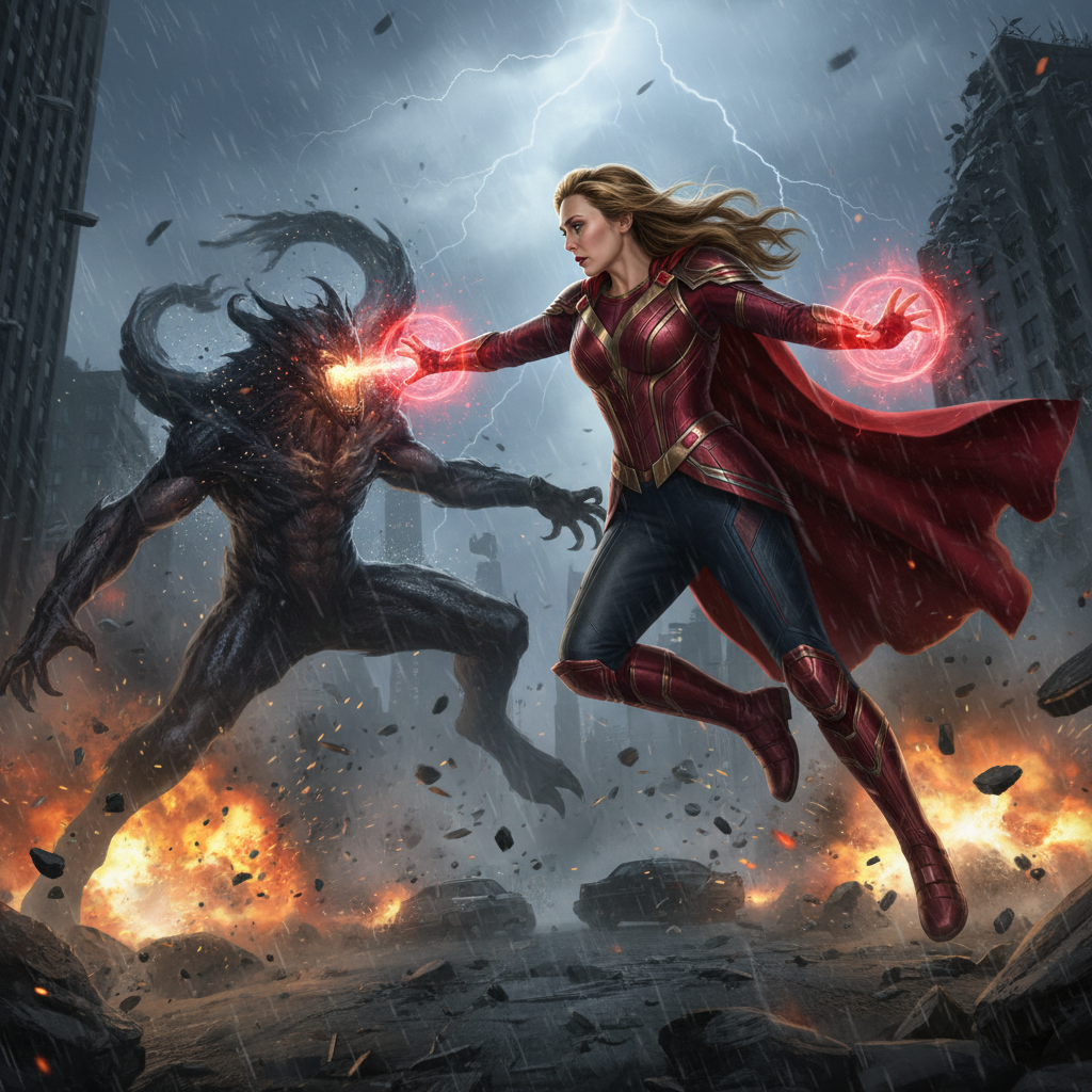 Elizabeth Olsen as a powerful superhero, capturing her Marvel impact