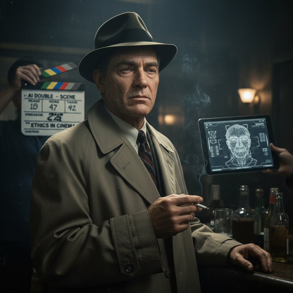 Actor’s face digitally replaced by AI double, highlighting ethical dilemmas in film production.