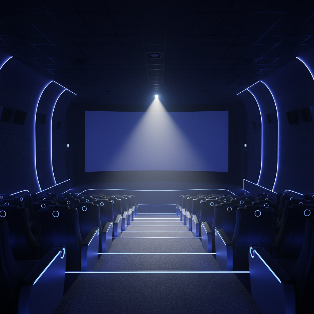 Alt text: Dramatic empty 4D movie theater with atmospheric lighting, sense of anticipation, movie 4d movies.