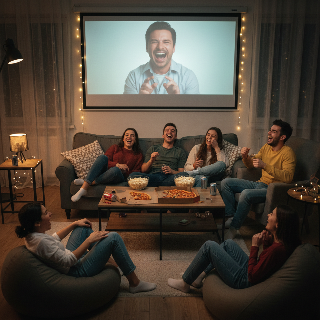 Alt text: Diverse group of friends sharing a laugh during an above average comedy film night, cozy and joyful setting