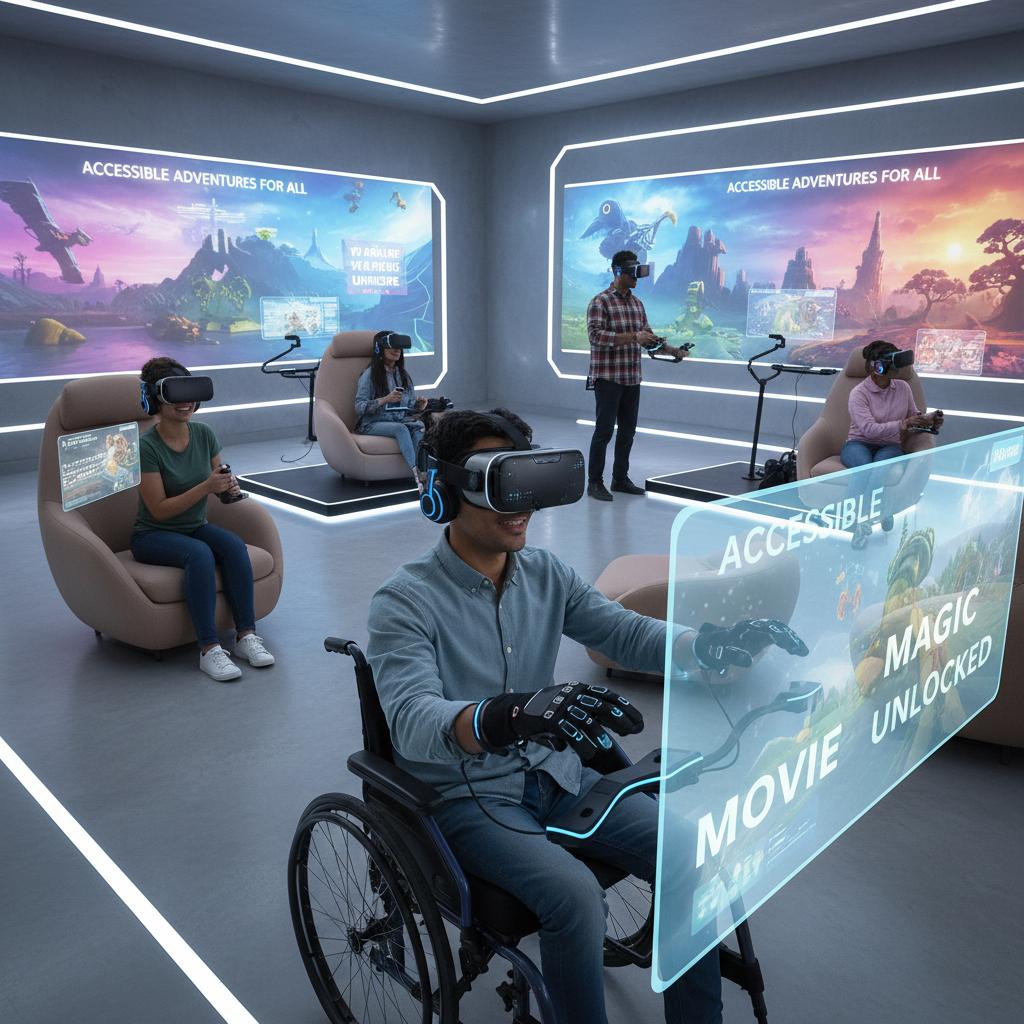 Alt text: Users with VR headsets enjoying an accessible gaming and movie environment tailored for diverse abilities.