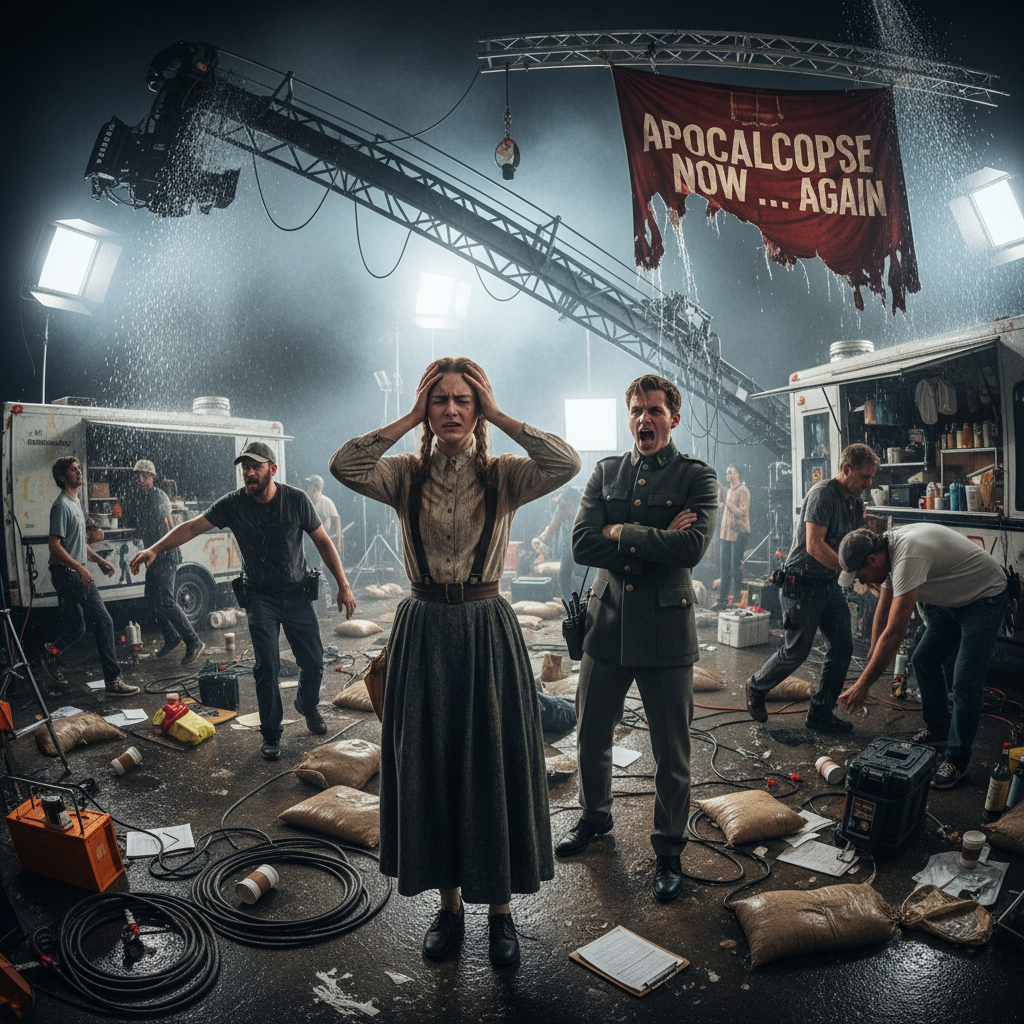 Image: Actors mid-meltdown on a chaotic set, illustrating behind-the-scenes disasters that spark accidental comedy.