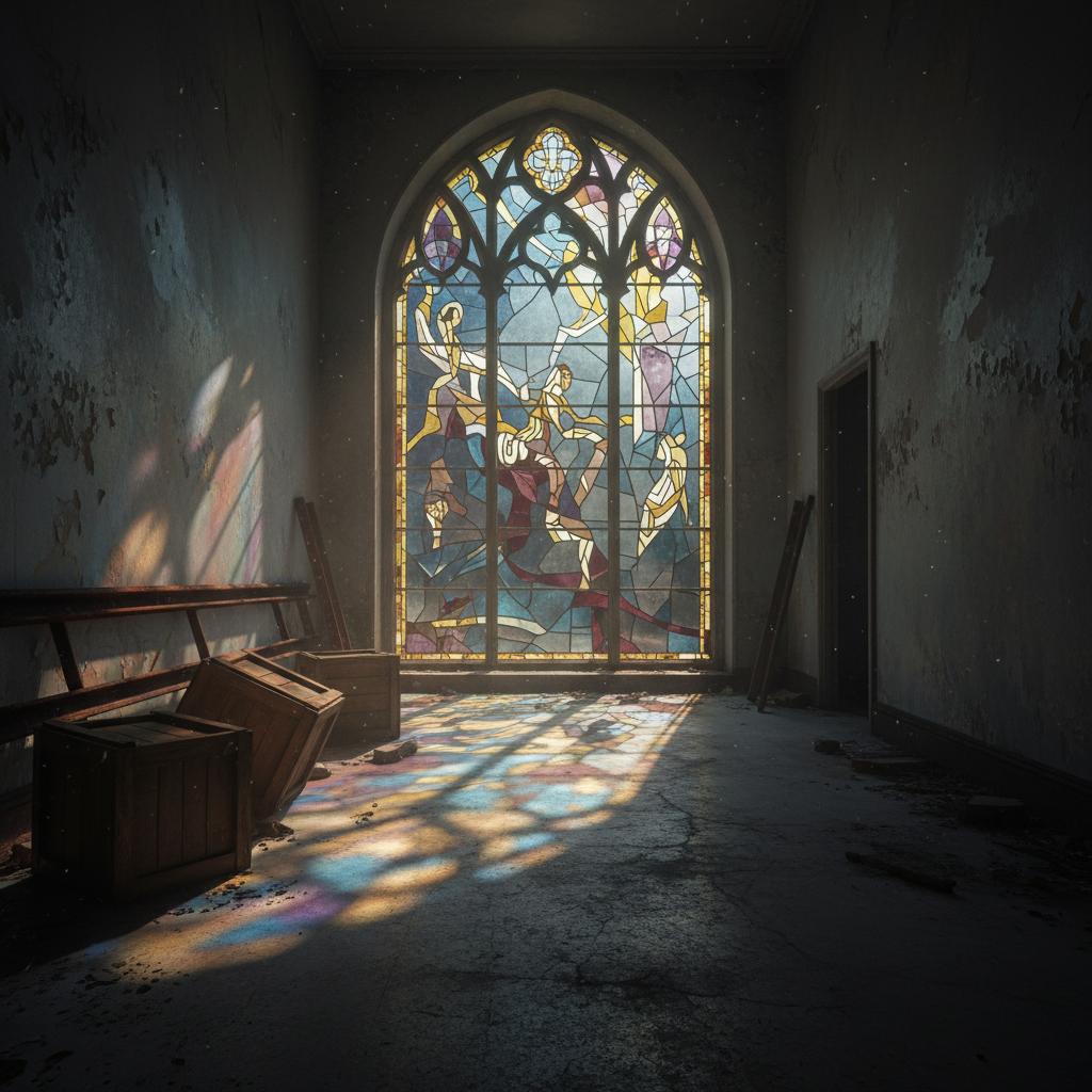 Alt text: Symbolic use of light and shadow in films about atonement, featuring an empty corridor and stained-glass window.