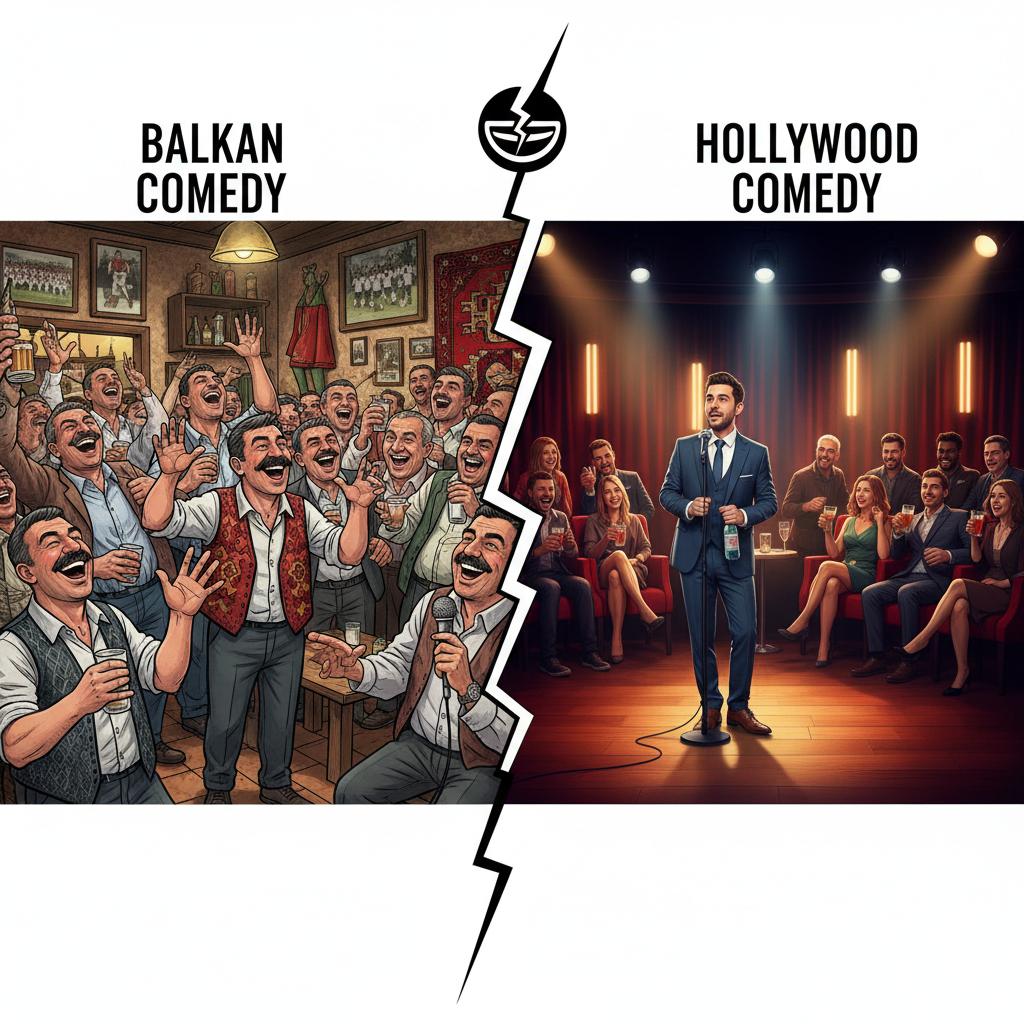 Split-screen photo compares a gritty, chaotic Balkan comedy scene with a polished Hollywood laugh track moment, underscoring the cultural gap in comedic sensibility.