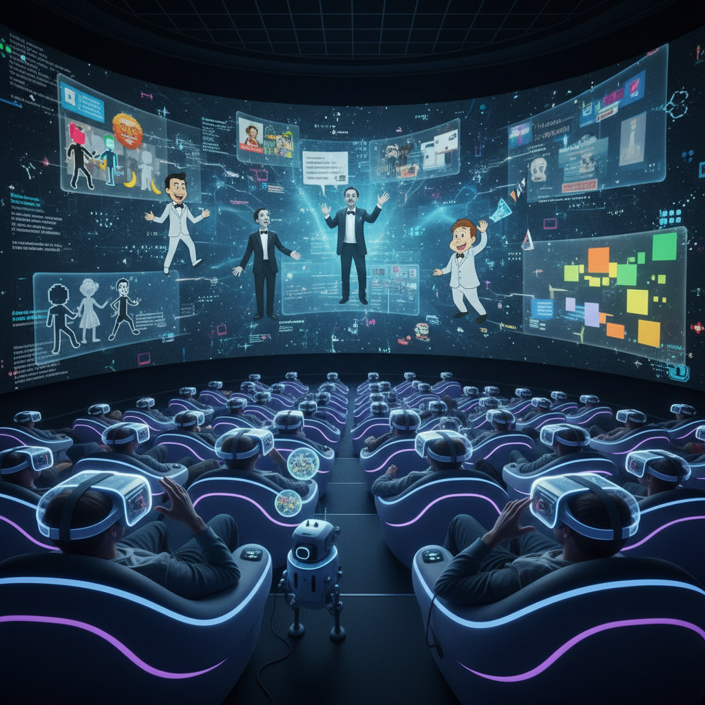 Alt text: Futuristic cinema audience immersed in subtle comedy in a globalized world, diverse group reacting thoughtfully to nuanced film scenes.