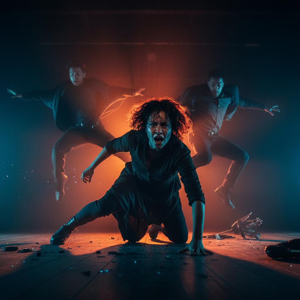 Actors expressing emotion through blocking in a dramatic scene, with movie blocking technique amplifying the mood.