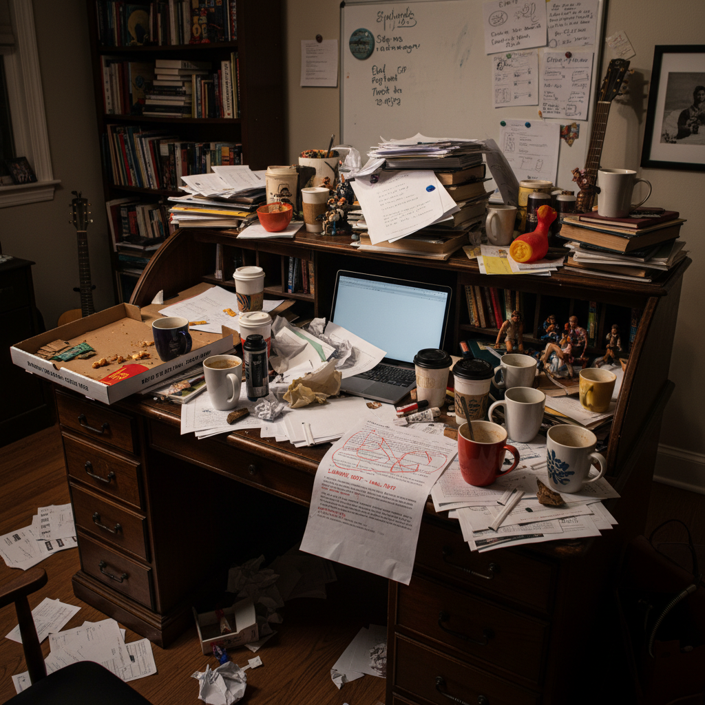 Alt: A creative workspace surrounded by stacks of comedy scripts and coffee cups, highlighting the creative chaos behind movie breakthrough comedy cinema.