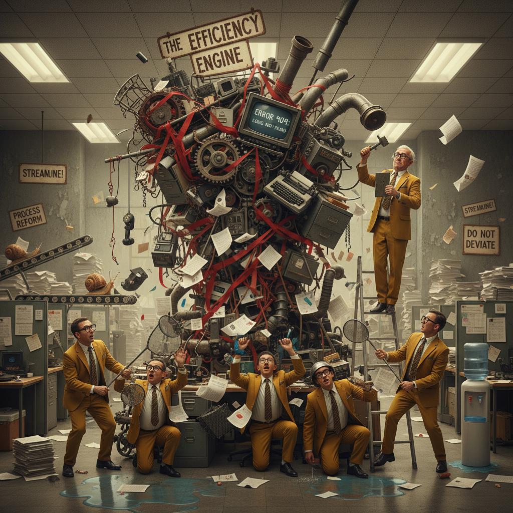 - Escalate the absurdity: Rules and red tape spiral out of control.