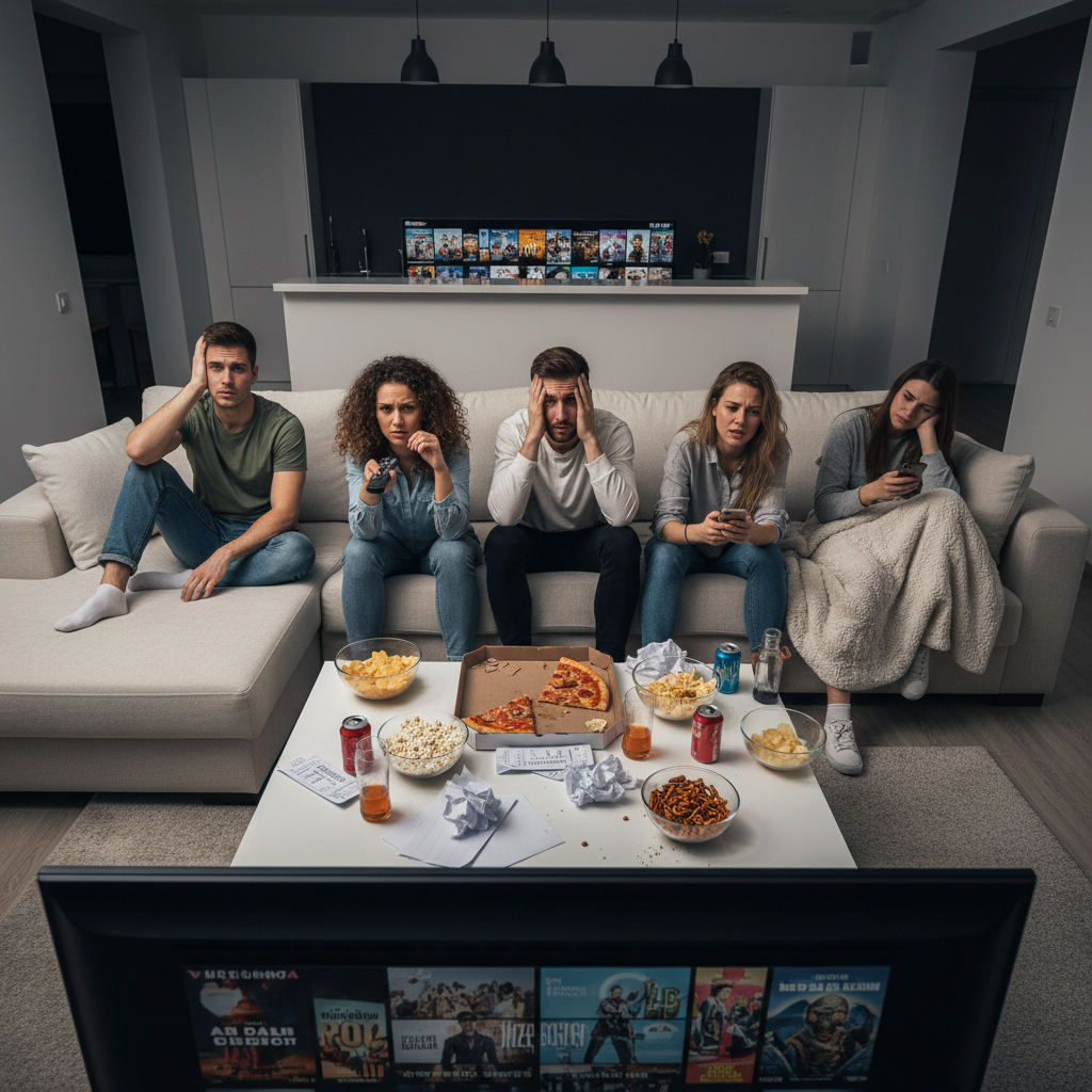 Movie night regret: The lingering dissatisfaction after a bad pick—often amplified in group settings.