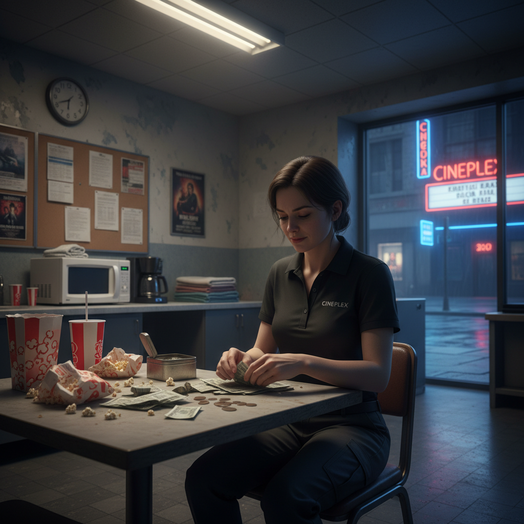 Alt text: Cinema worker counting tips after late shift in movie theater breakroom, coins scattered on table.