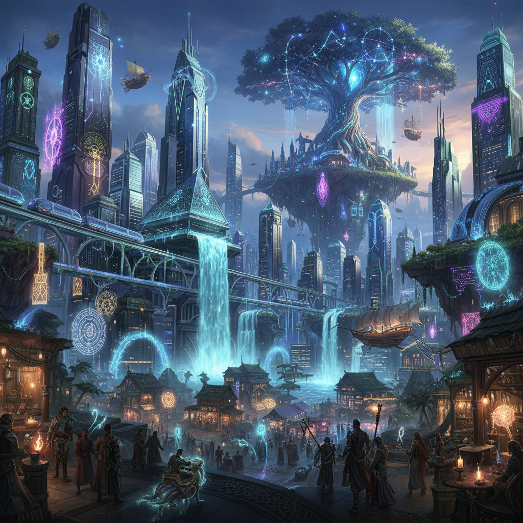Alt text: A futuristic city blends technology and magic in a vision of tomorrow’s contemporary fantasy films.
