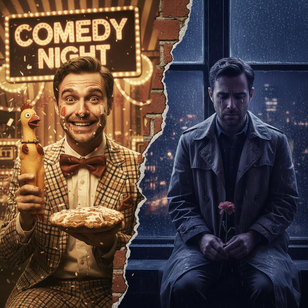 Photo: Split-frame shot of one actor in both comedic and dramatic moments, moody lighting—illustrating the genre’s blurred lines.
