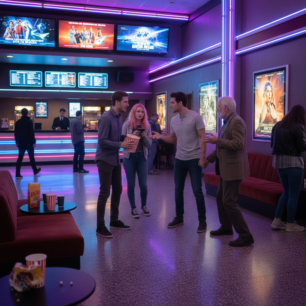 Descriptive alt text: Moviegoers of different ages debate over a comedy movie choice in a cinema lobby, highlighting generational divides in movie dated comedy cinema.