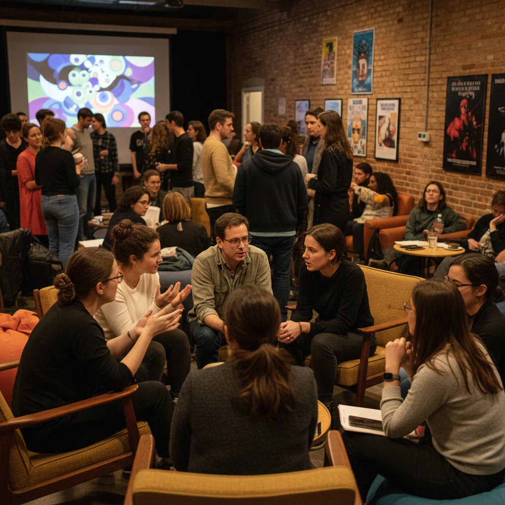 Alt text: Audience in lively post-film discussion, diverse crowd, animated debate on diverse rom com impact