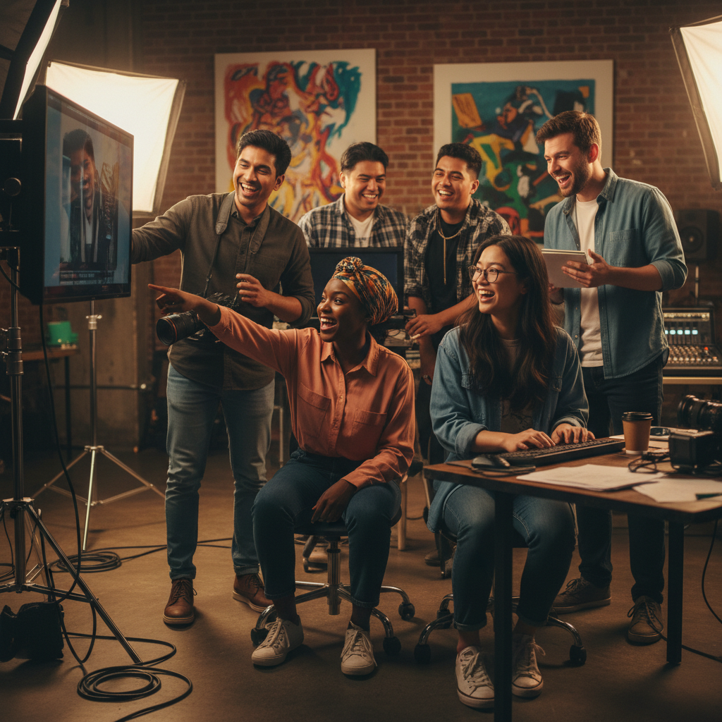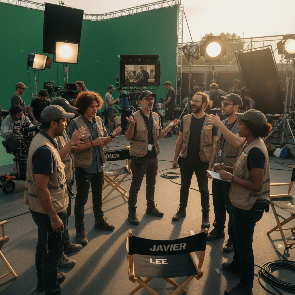 Alt text: Diverse filmmaking team in passionate creative discussion on set, expressing opinions on script choices, inclusive movie production scene