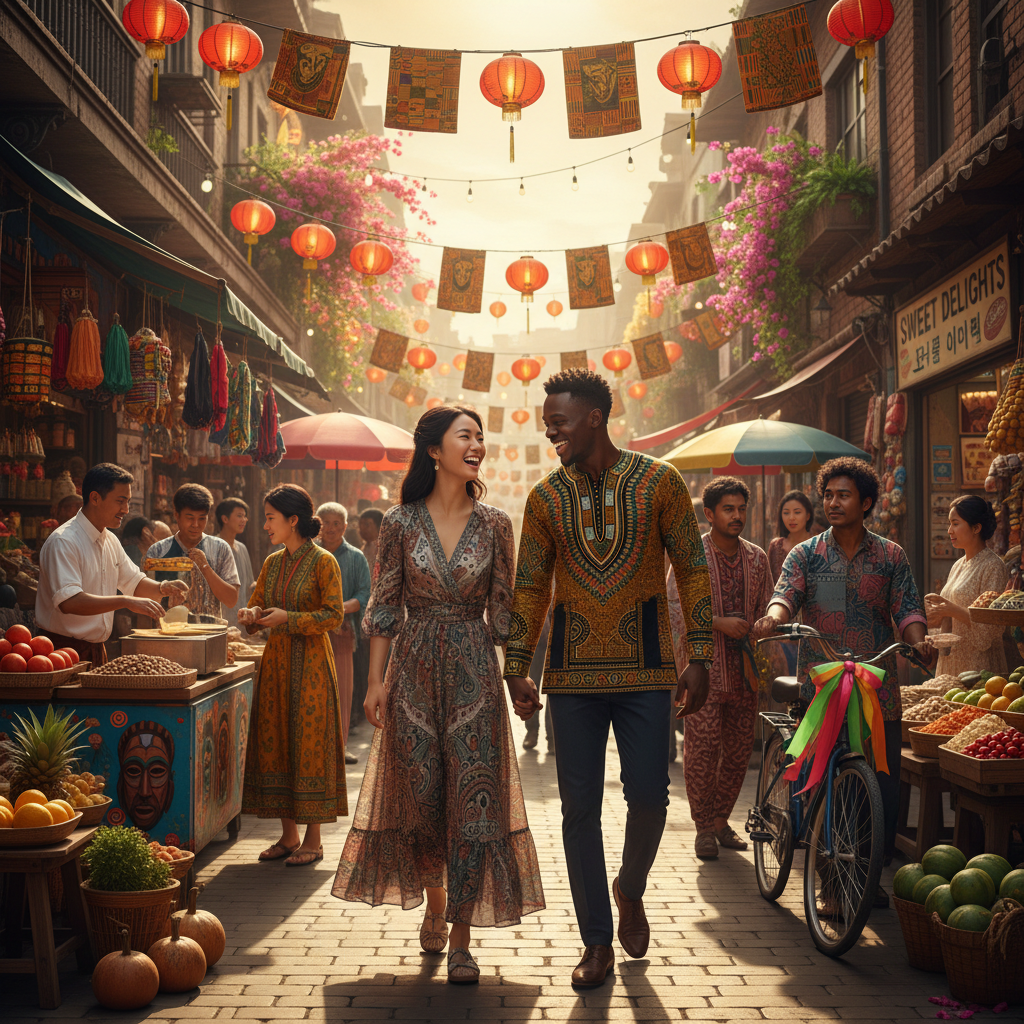 Alt text: Scene from a multicultural romantic comedy set in Asia or Africa, vibrant street details, joyful diverse cast