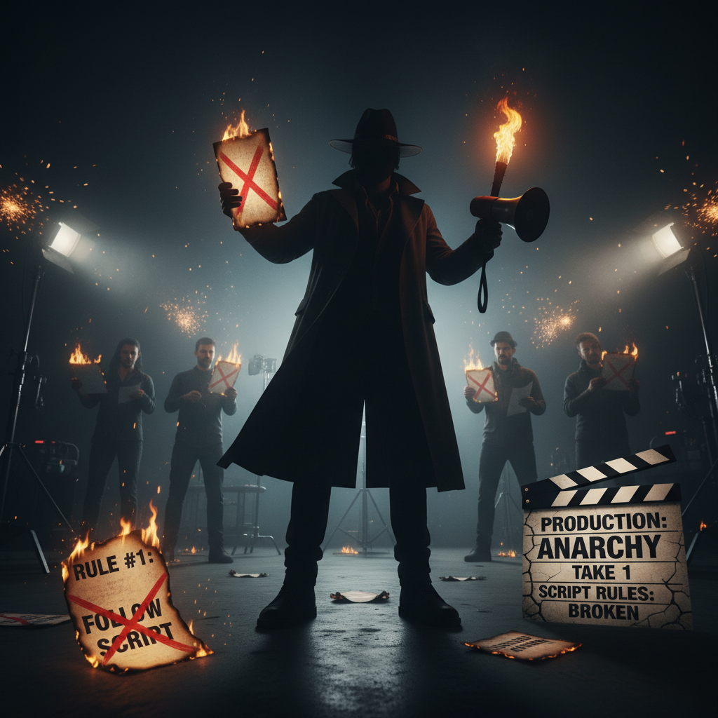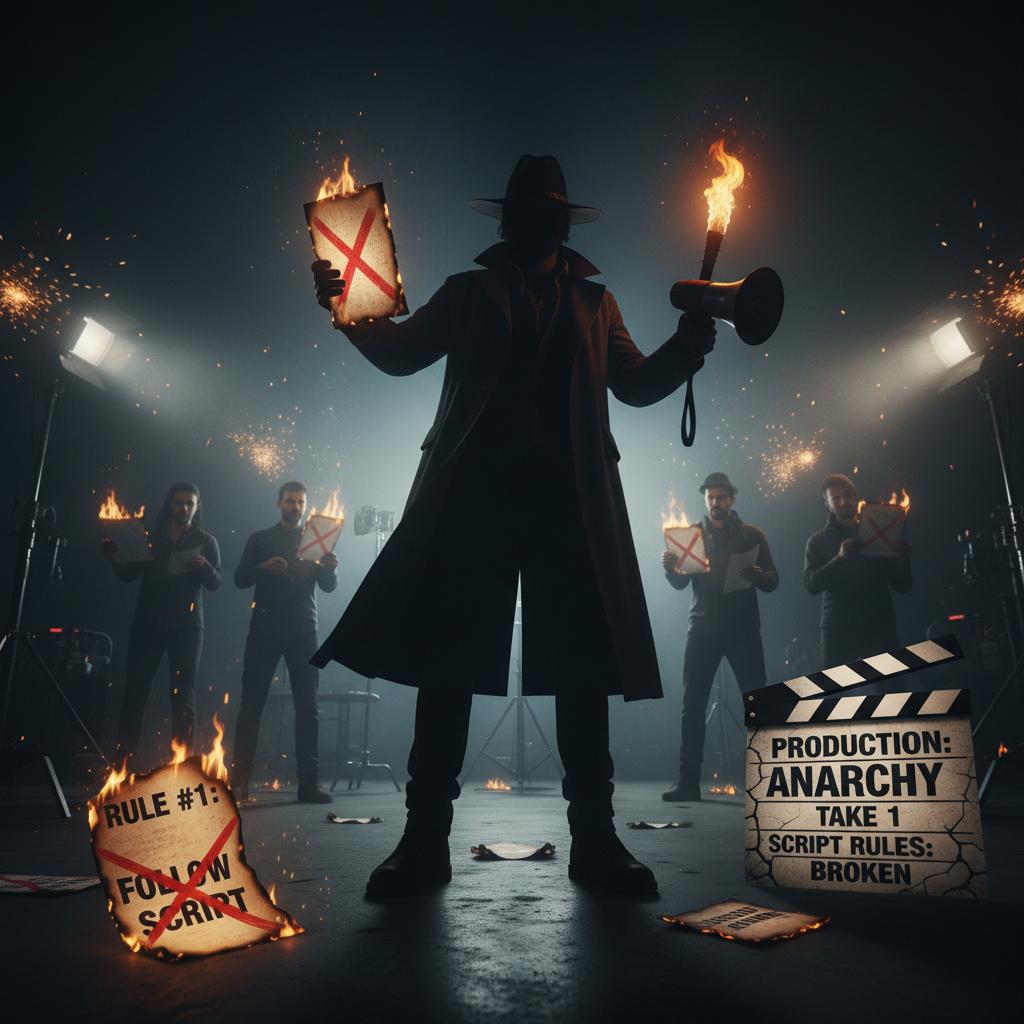 Director breaking script rules on a shadowy film set, embodying the ethos of movie everything fair game movies.