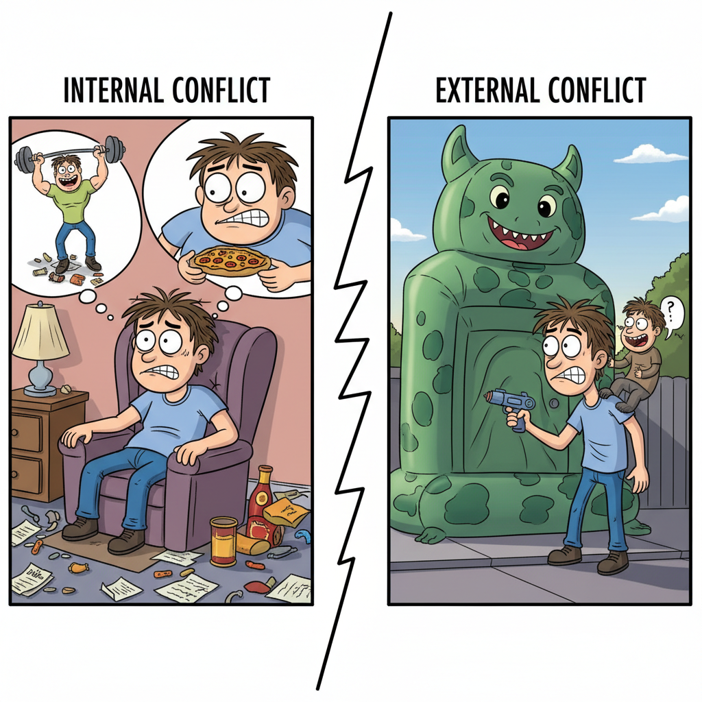 - External conflict: The struggle between a character and outside forces—other people, society, nature, technology, or fate. In comedy, these obstacles are exaggerated for maximum chaos and laughs.