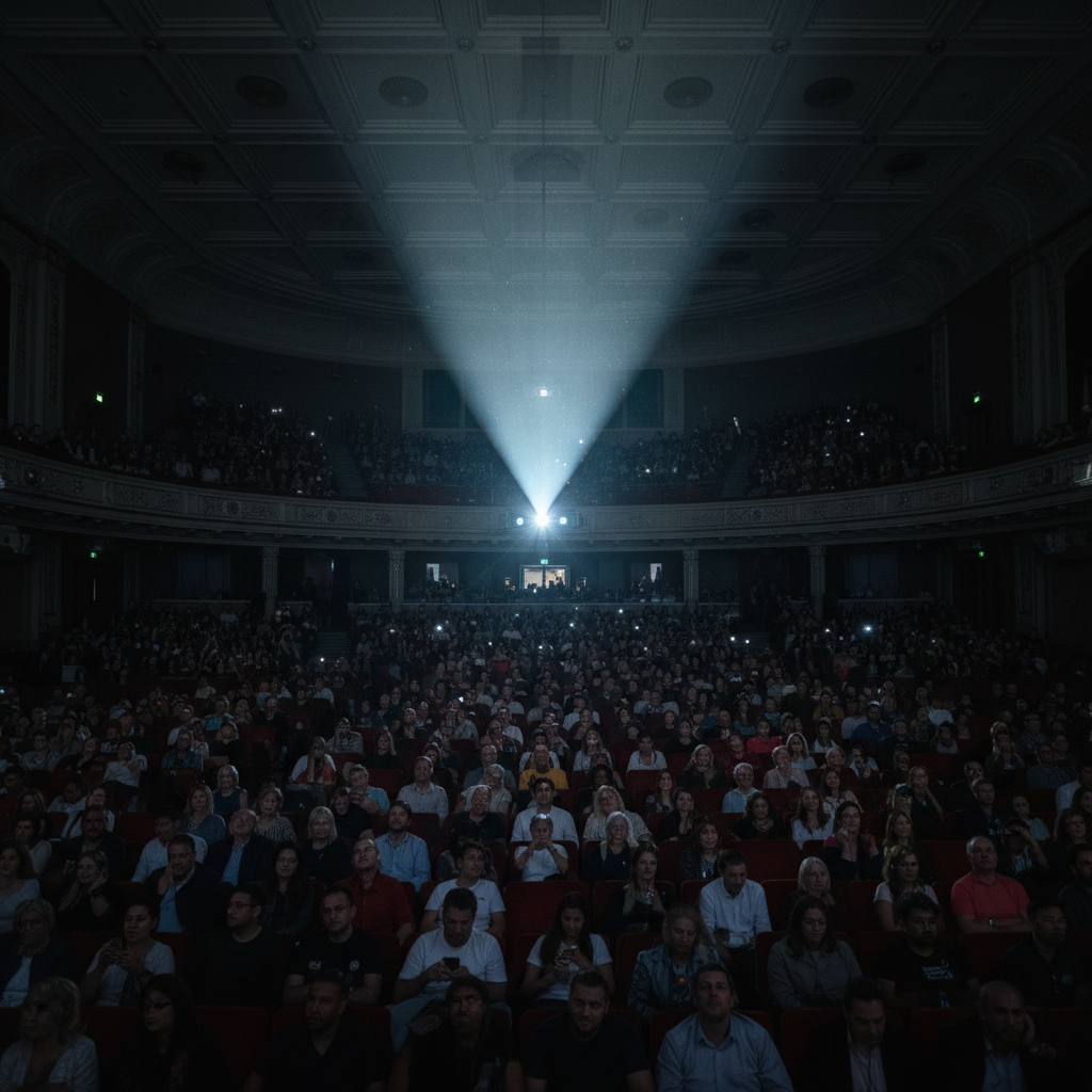 Alt text: Projector beam illuminating a packed audience during a film society screening, sparking lively reactions and cinematic debate