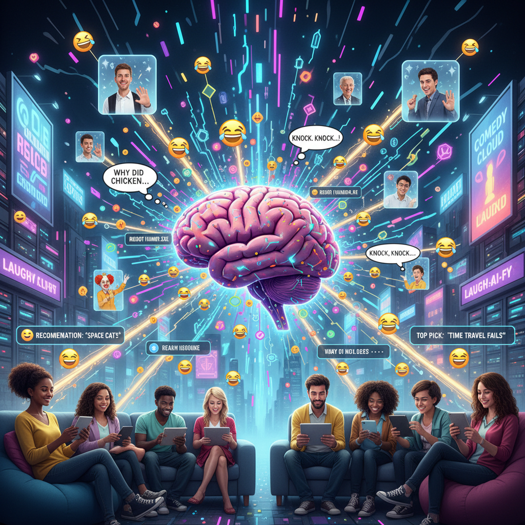 Alt text: AI data streams shaping comedy recommendations.