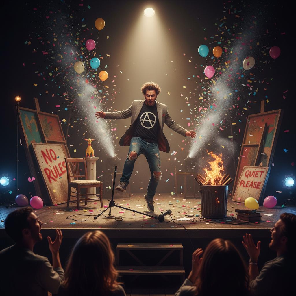 Comedian breaking the rules of traditional comedy on stage, spotlight, chaotic background; Alt text: 'Comedian breaking the rules of traditional comedy on stage.'