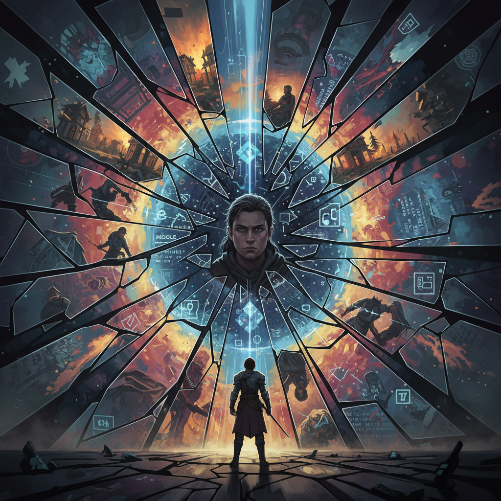 A protagonist in multiple realities, illustrating the complexity and evolution of the hero’s journey in modern cinema.