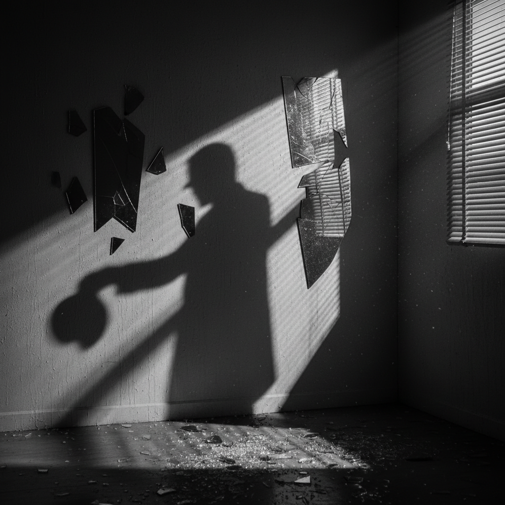 Alt: Character in shadow gazing into a shattered mirror, representing dual identity in movie infiltration movies.