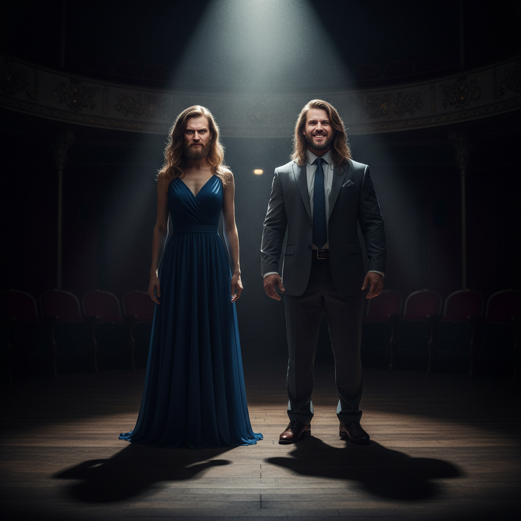 Image: Surreal illustration of two characters exchanging faces under a spotlight, dramatic lighting. Alt: Two figures exchanging faces in a surreal spotlight.