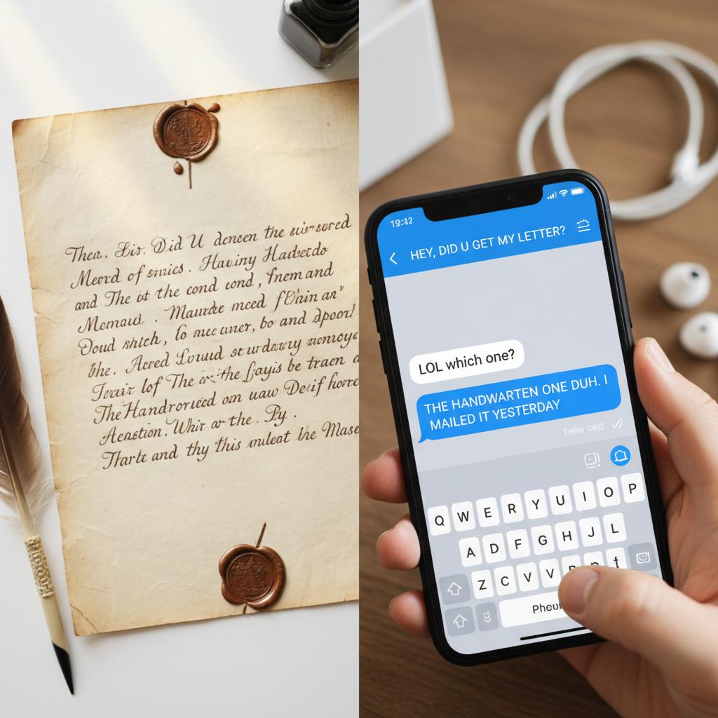 Handwritten letter and smartphone text in split-screen, showing the evolution of romantic communication in films.
