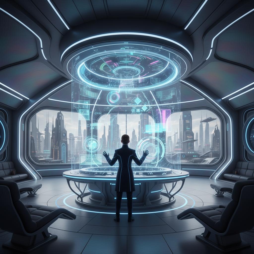 Alt: Futuristic media room with holographic AI-driven interface suggesting personalized movie choices.