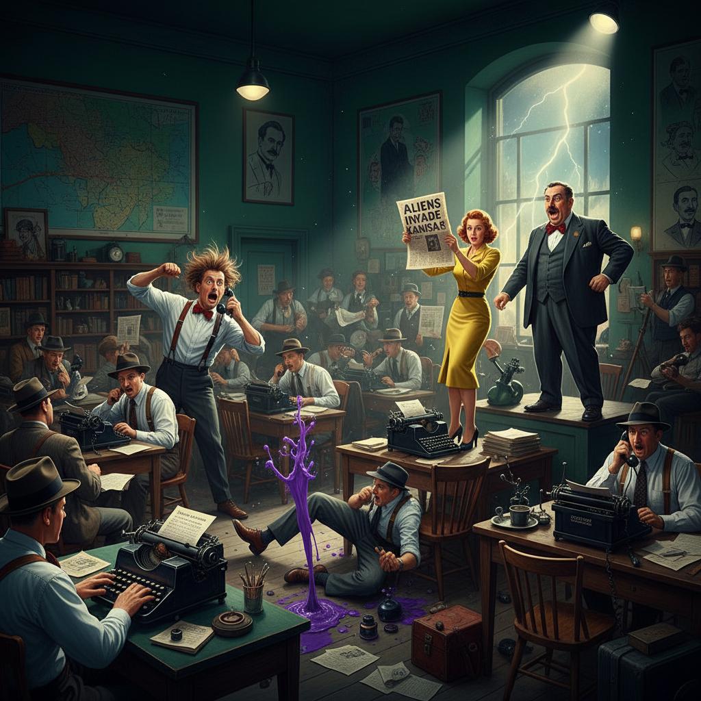 - Reporters as cartoonish figures, more interested in fame than facts.