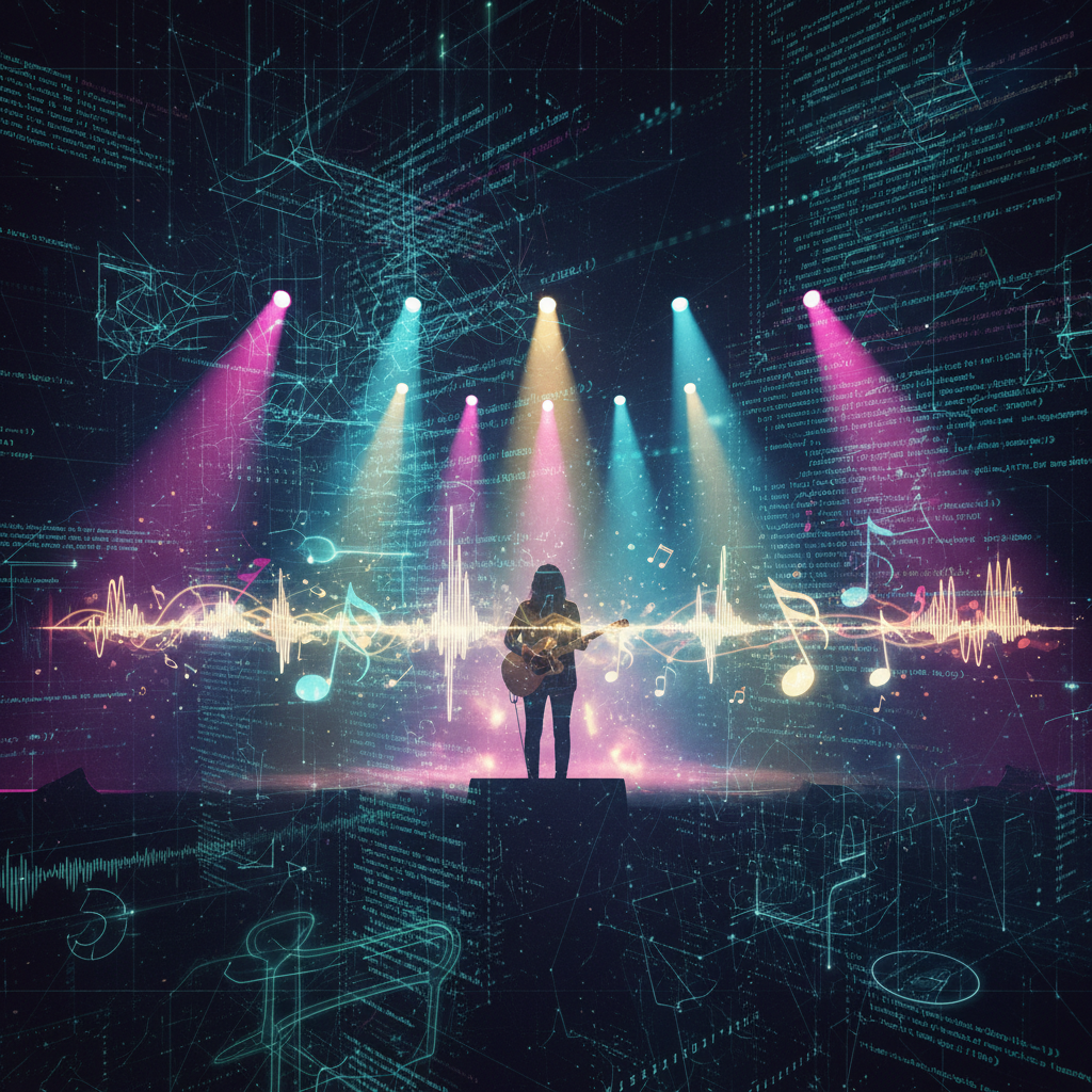 Abstract digital collage of AI code blending into vibrant stage lights and musical notes, representing the future of original movie musical comedy.
