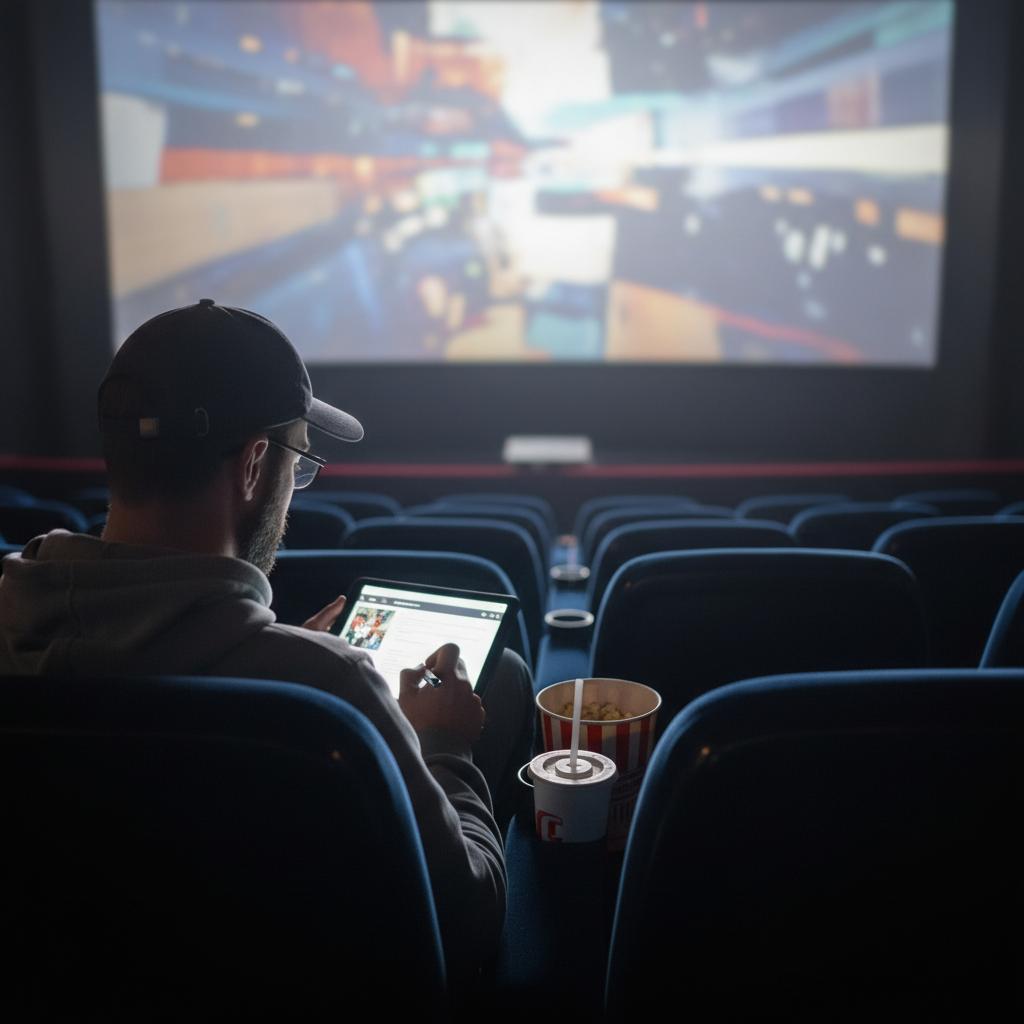 Alt text: A moviegoer jotting notes in the dim light of a theater, absorbed in the film and analyzing perfectionist details.