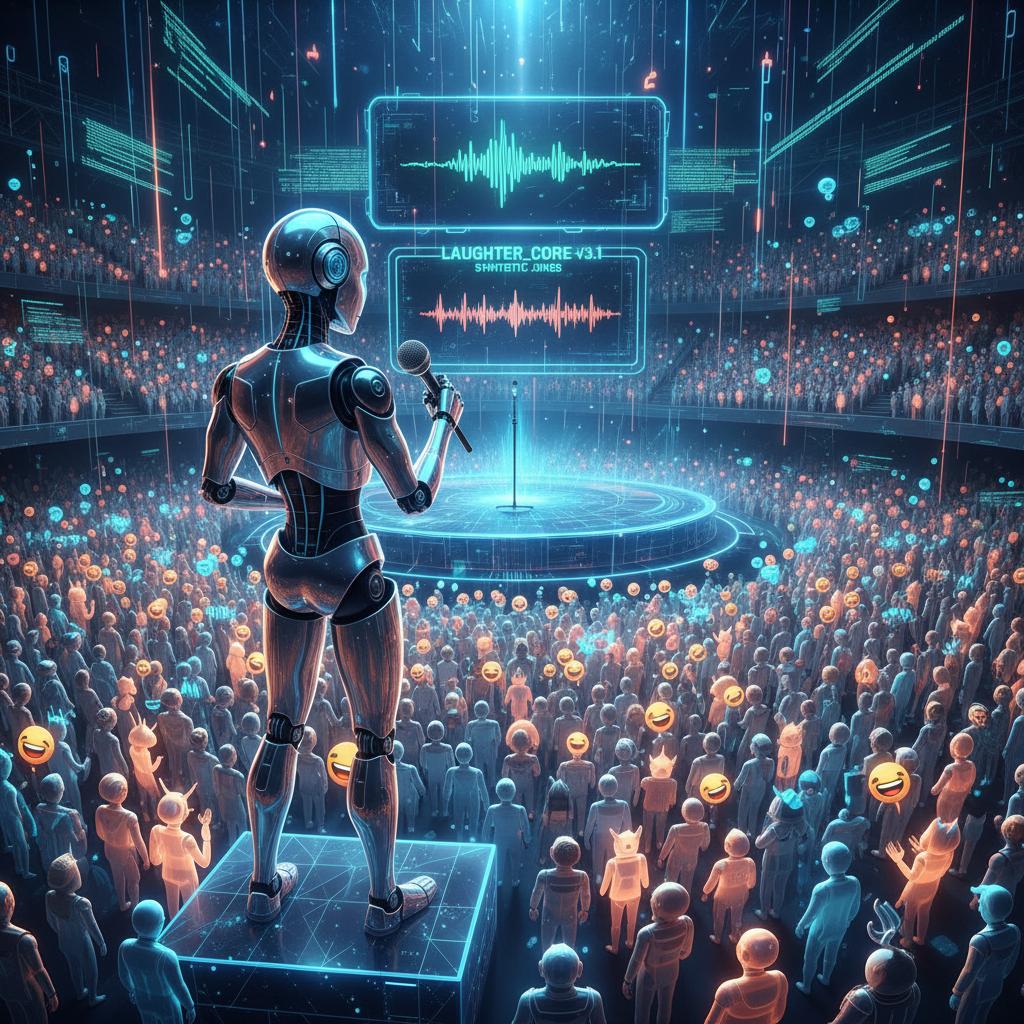 Alt text: AI-generated comedian performing for a digital audience, virtual comedy, future of entertainment