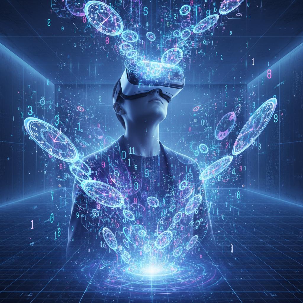 Image: Futuristic movie theater filled with holographic clocks, highlighting the next phase of real-time cinema.