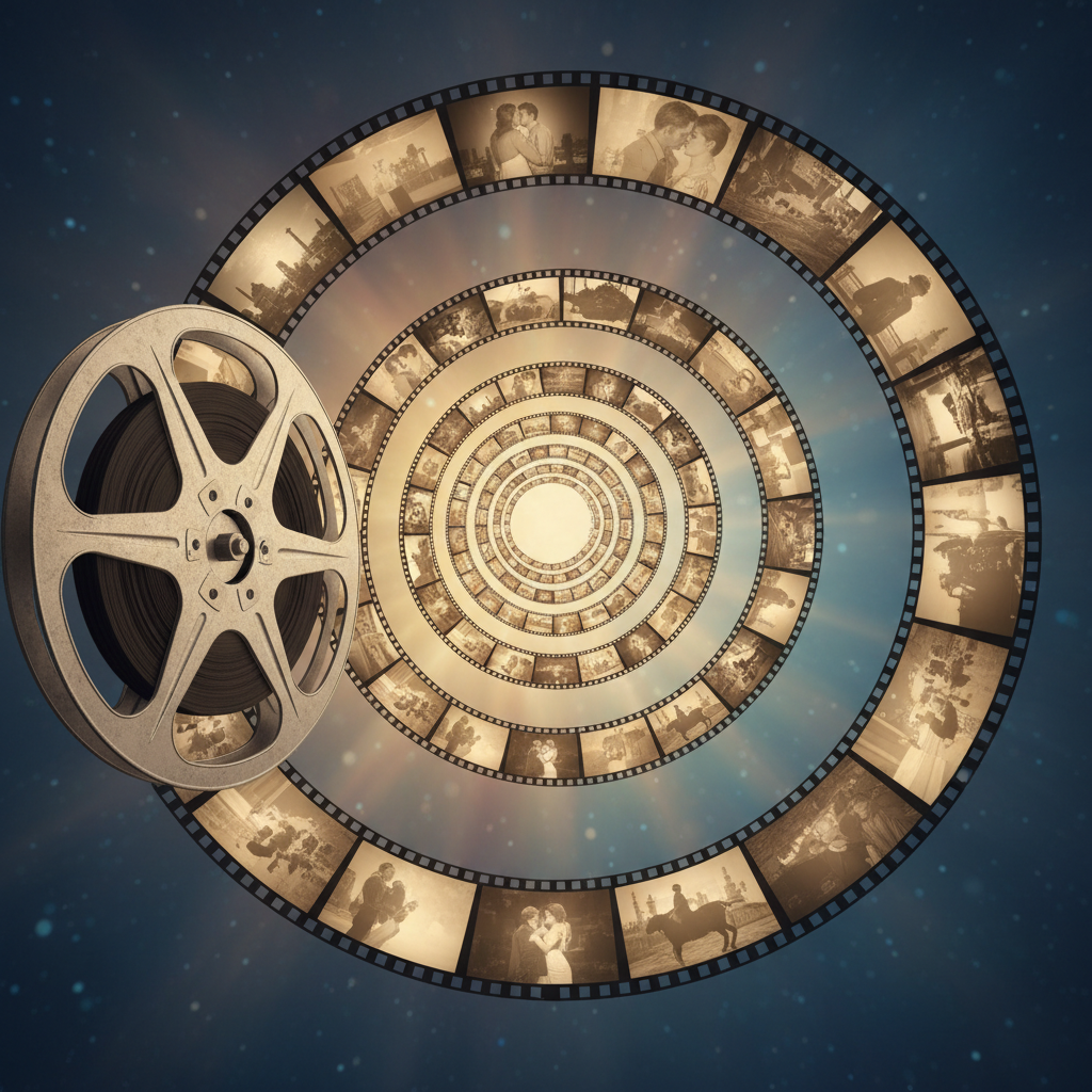 Alt text: Symbolic photo of open film reel with spiraling frames, representing endless regression movie possibilities.