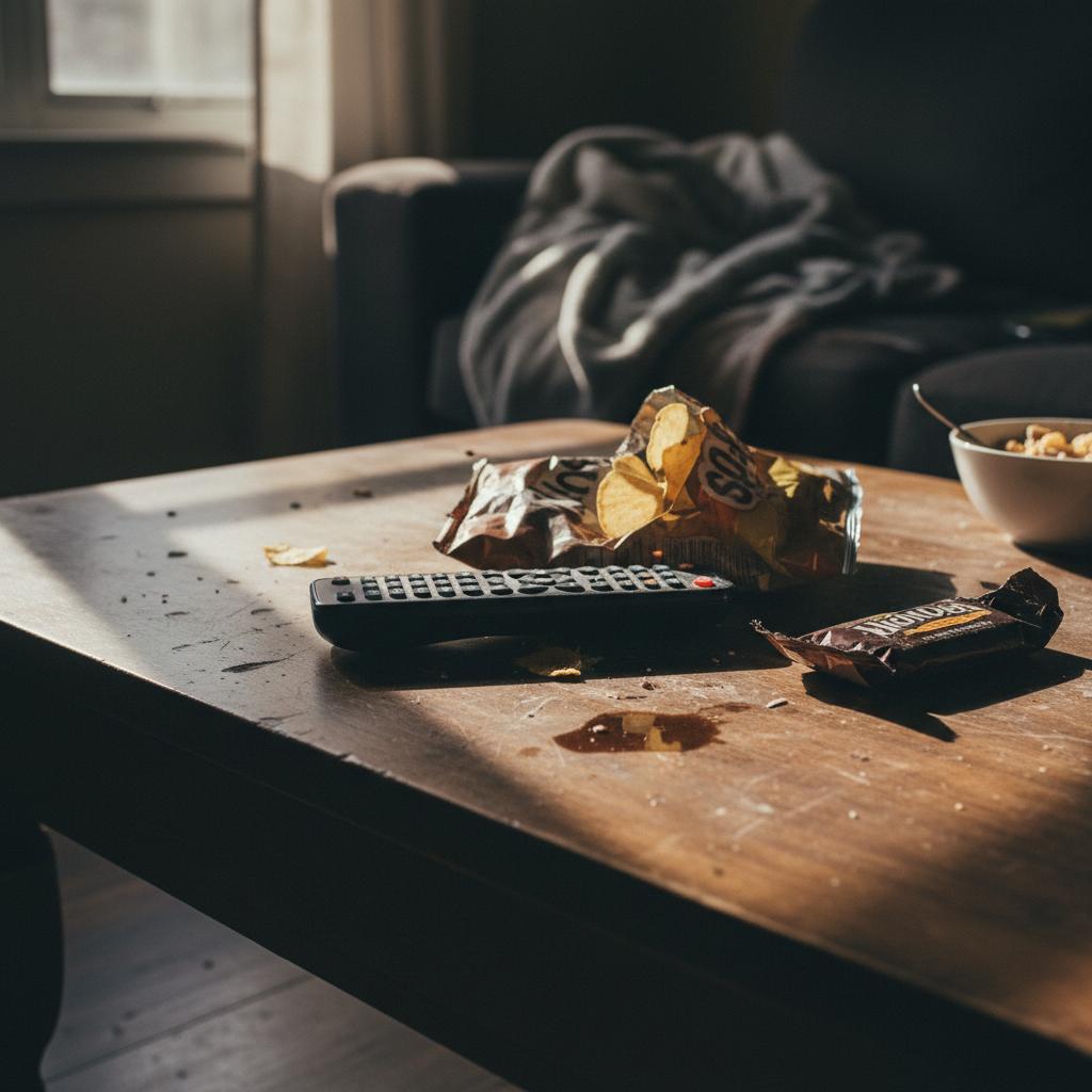 Remote control surrounded by snacks on a table, movie reliable comedy movies