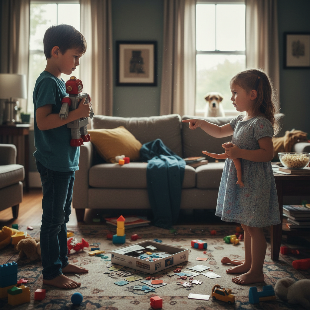 Alt: Two siblings in a tense standoff, reflecting rivalry in a family setting.
