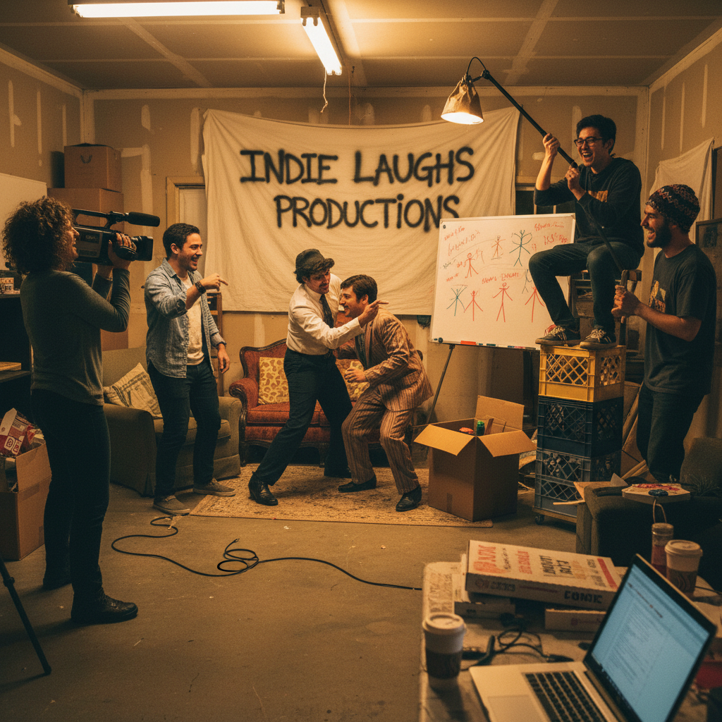 Indie comedy crew collaborating on a shoestring set, demonstrating teamwork behind successful movie small comedy movies.