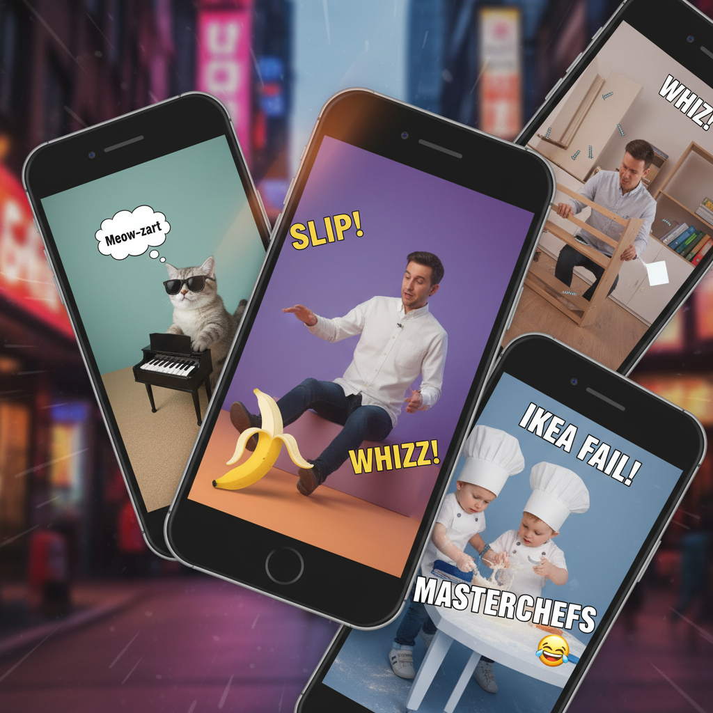 Alt: Social media feeds filled with experimental comedy videos, reflecting the rise of short-form humor in the digital age.
