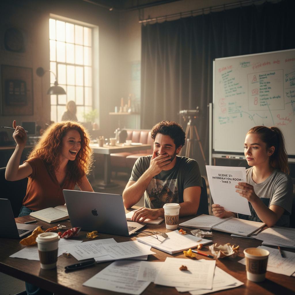Image: Behind-the-scenes shot of young writers brainstorming in a modern studio.