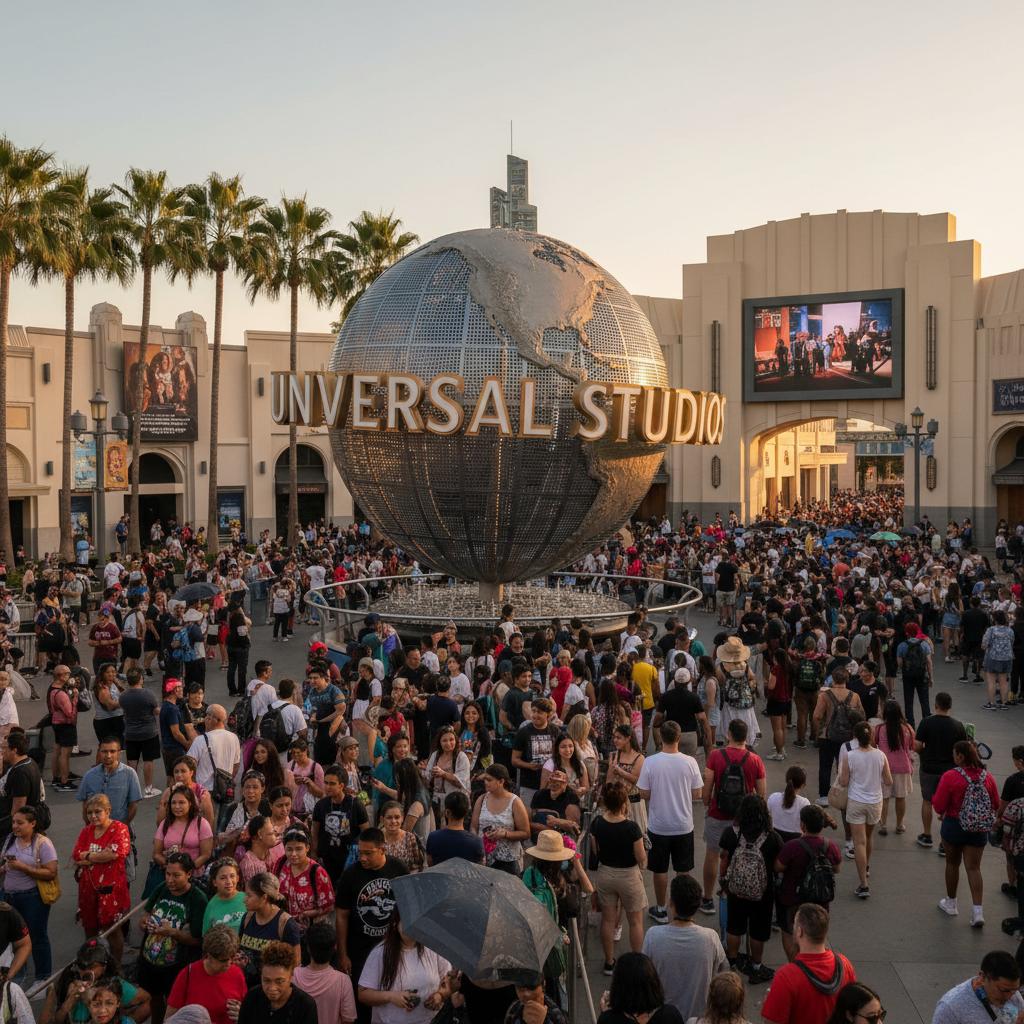 Image: Wide shot of crowds queuing beneath the iconic Universal Studios globe, capturing the spectacle and anticipation of a major studio tour.