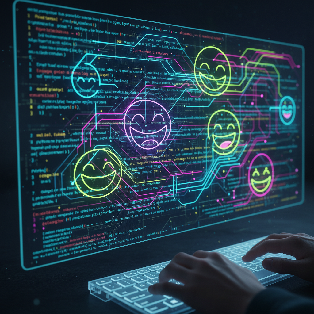 Descriptive alt text: Abstract photo showing tangled algorithm code morphing into neon laughing faces, symbolizing complexity of comedy recommendations, movie system working comedy, and AI challenges