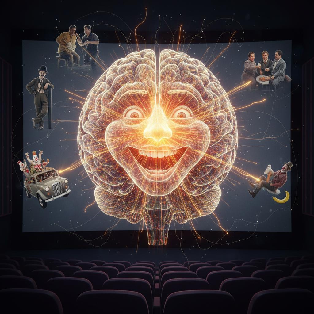 Image: Artistic depiction of brain activity during laughter. Alt: Brain circuitry lighting up during a comedy scene, movie target audience comedy cinema