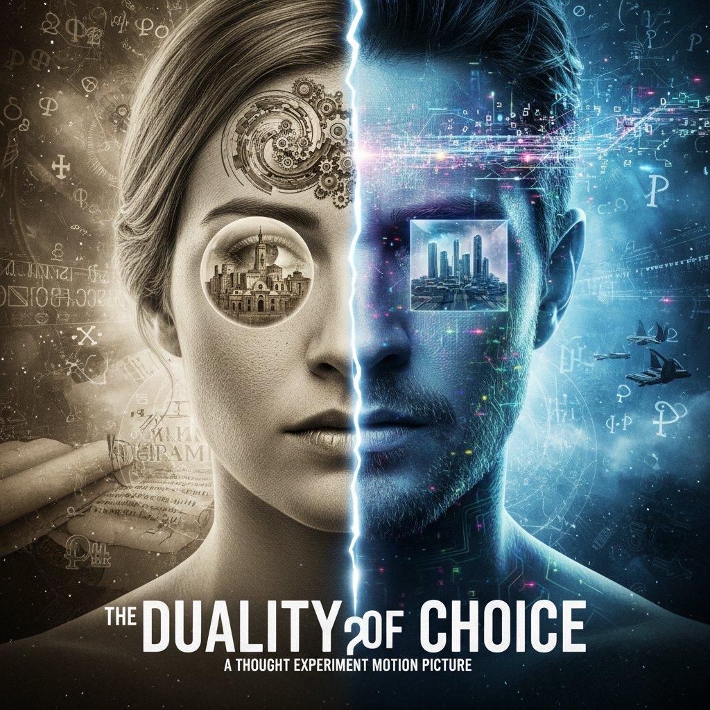 Alt text: A stylized split-face portrait showing two versions of the same character in conflicting realities, illustrating inner conflict in thought experiment movies.