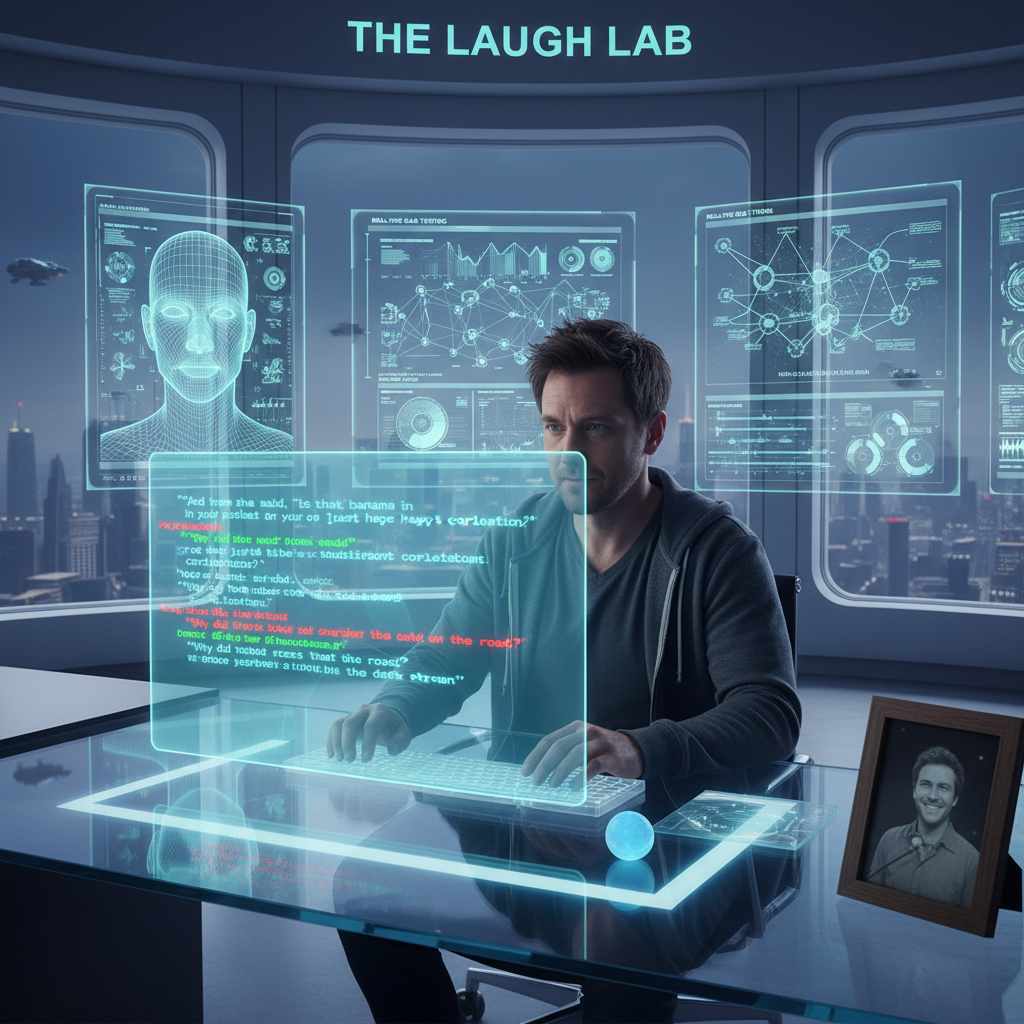 Alt: AI-powered film studio analyzing comedy movie scripts, futuristic workspace, comedy analytics.