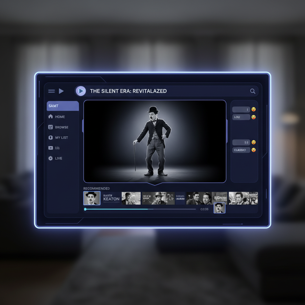Alt text: Charlie Chaplin meets digital streaming, blending old and new comedy cinema.
